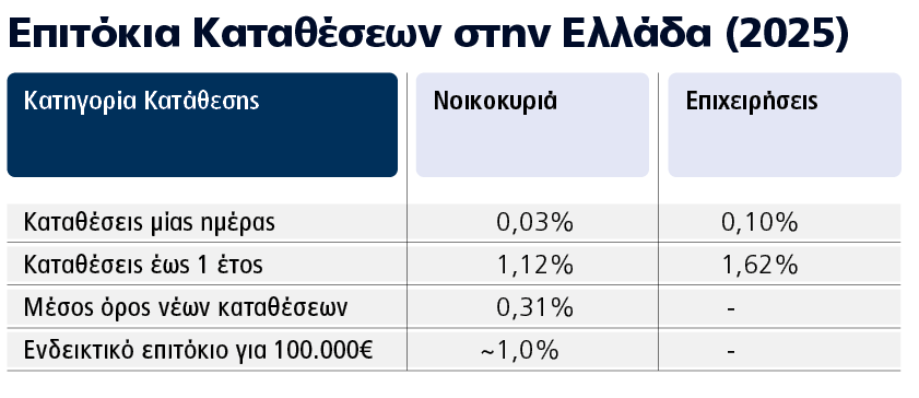 Στην πράξη, το επιτόκιο για μια κατάθεση γύρω στις 100.000 ευρώ κινείται πέριξ του 1%. Δηλαδή, ακόμη και σε μεγάλα ποσά η απόδοση είναι σχεδόν μηδενική. Επομένως οι καταθέσεις προσφέρουν ασφάλεια και όχι απόδοση. Παρά τα χαμηλά επιτόκια, οι καταθέσεις συνεχίζουν να αυξάνονται, κυρίως λόγω των εκταμιεύσεων δανείων που επιστρέφουν στο τραπεζικό σύστημα. Αυτό όμως δεν αντικατοπτρίζει απαραίτητα μια πραγματική αύξηση της αποταμίευσης. Τον Σεπτέμβριο του 2025 οι καταθέσεις του ιδιωτικού τομέα αυξήθηκαν κατά 2,65 δισ. ευρώ, έναντι 2,05 δισ. ευρώ τον Αύγουστο.