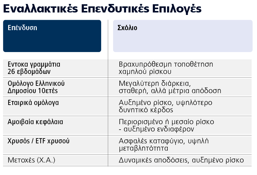 Εναλλακτικές επιλογές όπως έντοκα γραμμάτια, ομόλογα (Ελληνικού Δημοσίου και εταιρικά) και αμοιβαία κεφάλαια κερδίζουν έδαφος, ενώ οι νέοι στρέφονται και σε νομίσματα, χρυσό και ψηφιακές επενδύσεις μέσω διαδικτυακών πλατφορμών.
